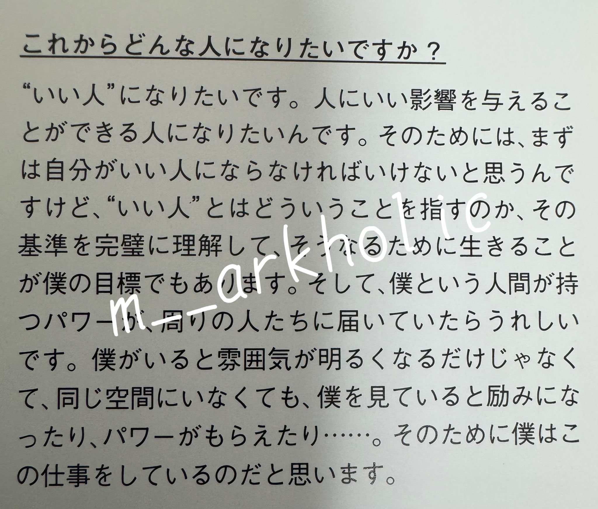 마크 : "좋은 사람"이 되고 싶어요. 타인에게 좋은 영향을 줄 수 있는 사람이 되고 싶어요. 그러기 위해서는 먼저 자신이 좋은 사람이 되어야 한다고 하는데 "좋은 사람"은 어떤 걸 말하는지 그 기준을 완벽하게 이해하고 그렇게 되기 위해서 사는 게 제 목표입니다 그리고 저라는 인간이 가지고 있는 힘이 주변 사람들에게 닿으면 좋겠어요 제가 있으면 분위기가 좋아진다 같은 게 아니라 같은 공간에 있지 않아도 저를 보고 있으면 위로가 된다든가 힘을 받을 수 있다든가 그걸 위해서 저는 이 일을 하고 있다고 생각해요.