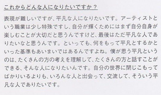 해찬 : 표현하기 어렵지만 평범한 사람이 되고 싶어요. 아티스트라는 직업은 조금 특별하고, 빛을 보기 위해서는 먼저 자신이 즐기는 것이 중요하다고 생각하지만, 결국에는 평범한 사람이 되고 싶다고 생각합니다. 그렇긴 하지만 평범이 무엇인지에 대한 기준은 조금 애매하긴 합니다. 제 생각에 그런 보통의 사람이 되기 위해서 많은 사람들의 생각을 이해하고 많은 사람들과 대화할 수 있는 사람이 되고 싶어요. 항상 제 자신만의 세계에 머물기보다는 많은 사람들을 만나고 교류하며 그런 평범한 사람이 되고 싶어요.